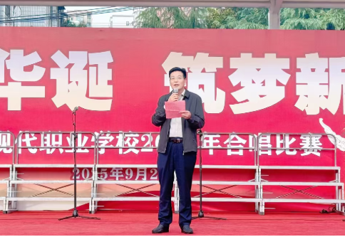 校党委书记苗维爱为本次合唱比赛致辞,他指出本次比赛既是一场用歌声礼赞祖国的盛会,更是一次以旋律凝聚力量、以信仰引领成长的思政课堂,同学们通过此次活动以红歌为媒,不仅是歌颂祖国的辉煌成就,更是要从歌声中汲取奋进的力量,把爱国情、强国志、报国行融入专业学习和技能成长中。